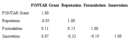 To analyse the different sources of being first and recurrently granted, we followed a two-step approach. Firstly, we defined each type of source according to the theoretical framework: market reputation, formulation skills and innovation capabilities. Based on section 2, we expanded the sources of recurrence to all firms that had ever applied to FONTAR, whether they were granted or not. We ran a principal component analysis (PCA) on each set of key variables on applicant firms. This allowed us to identify a common vector of means for each theoretical determinant of recurrently accessing public funds based on the whole population of applicants (JACKSON, 2003). In addition, the correlation within the variables in each set is relatively high, thus it is worth integrating them into a single value1. Following Srholec and Verspagen (2012) we ran a PCA separately on each set of sources of recurrence for all the firms that had applied to FONTAR. As usual, we kept the first component. The underlying idea is that each source is present in every firm, to the extent that they refer to the aspects needed to face Schumpeterian market competition.