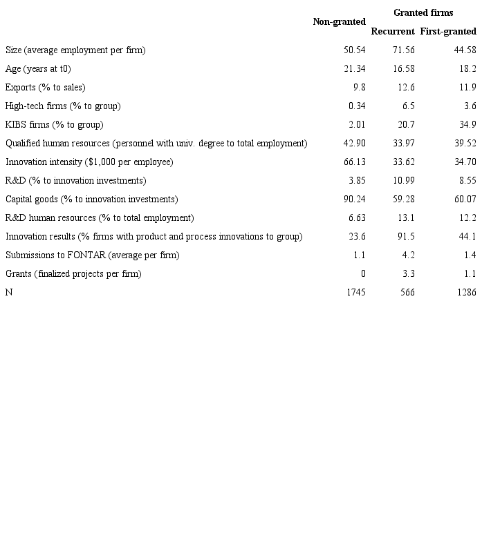 Table 2 shows that large differences are observed between granted and non-granted firms. The level of investments in innovation activities is the only variable in which non-granted firms show better behaviour, although 90% of that is explained by investments in capital goods. Among granted firms, recurrent firms are on average larger but younger, with a greater participation of high-tech companies than non-recurrent ones. Differences in terms of exports and innovation intensity are less significant, in both cases concentrated on capital goods. However, recurrent firms invest relatively higher levels in R&D activities. Regarding FONTAR, recurrent firms have a higher frequency of presentations and finalized projects than first-granted ones, and most of the former reached innovation results during the period under analysis.