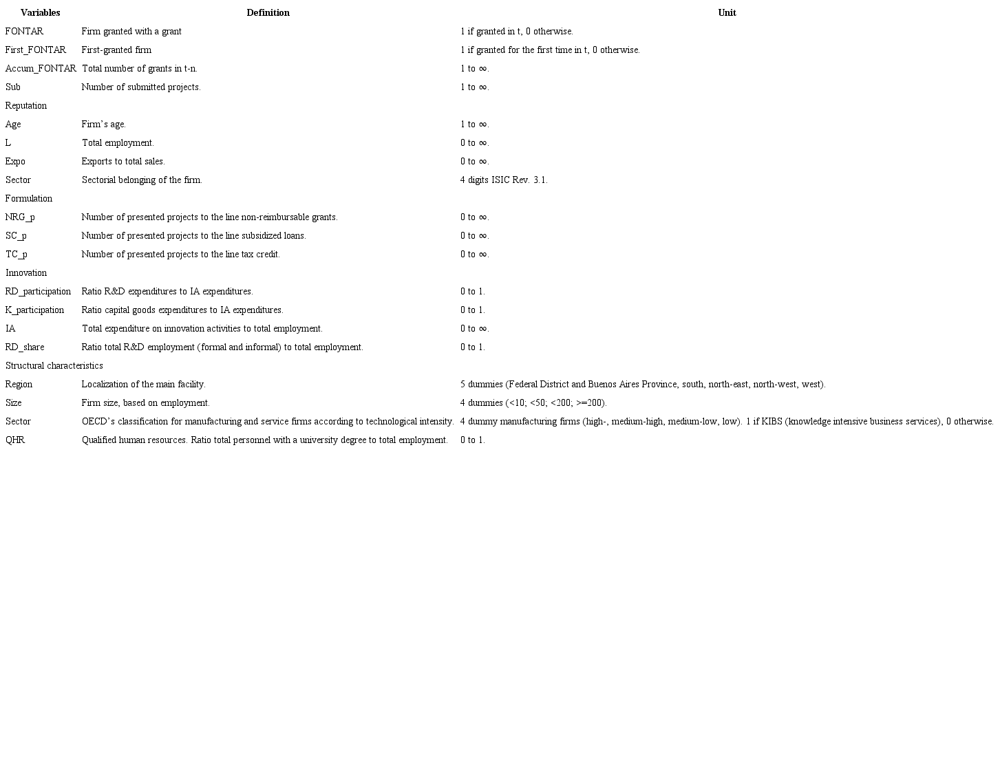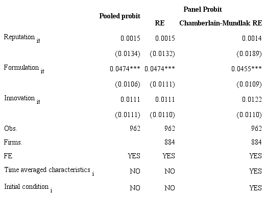 Where being first granted with a FONTAR grant for the firm i at time t (First_FONTARit depends on the sources of being granted (reputation, innovation and formulation) plus a set of observable and time-variant and invariant attributes (Xit ) and a set of unobservable and time-invariant characteristics (). The observable attributes are the usual structural and control variables (see Table 4 above). represents the unobservable characteristics and initial condition, which were approximated by means of the average value of sales and employment (), plus a dummy variable that accounts for submissions at . Ti is a set of dummy variables to control time. is the usual error term.