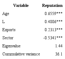 Market reputation was estimated by means of each firm’s age, export intensity, level of employment and sector of activity based on ISIC. The size and age of the firm shed light on the possibilities of being known in the market. In addition, given the historical cycles of economic instability in Argentina, a firm’s having survived different macroeconomic and institutional contexts sheds light on its resilience to survive (LOPEZ, 2006; SUÁREZ et al., 2014). Another element included is export intensity. Since the Argentinean productive structure shows low levels of exports (BARLETTA; PEREIRA; YOGUEL, 2014; PORTA, 2006), being part of the international market means higher levels of competitiveness and thus a “higher” perception of the firm. Finally, there is the sector of activity. Given the bias of FONTAR and the specific aim to develop high-tech firms in the basis of the programme - and in the strategic national plan - there are incentives within the national agency in charge of the fund to allocate resources to such firms (PORTA; LUGONES, 2011). Results from the PCA show only one significant component that accounts for larger and older firms (Table 4).