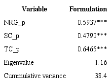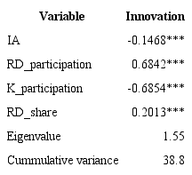 Again, only the first component presents an eigenvalue higher than one (Table 6). It accounts for firms with high levels of investments on R&D, both in financial and human resources. In addition, it represents firms with relatively low investments in innovation activities, which is highly correlated with the level of participation of capital goods expenditures.