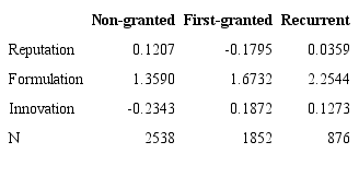 RQ1. To what extent is a firm’s first grant explained by its reputation, formulation skills and innovation capabilities?