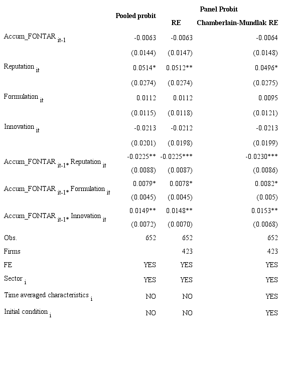 Estimation results of equation 2 are reported in table 93. Among granted firms, reputation is the only source of accessing FONTAR that is found to be positive and significant, which means that it increases the probability of being granted (by between +5.1 p.p. and +4.9 p.p.). However, reputation among past-granted firms negatively impacts on the probability of accessing, which means that the reputation source of the Matthew effect does not play the role expected in the literature (Accum_FONTARit-1*Reputationit ). The market reputation of firms that were granted in the past reduces the probability of being granted in the present by between 2.2 p.p. and 2.3 p.p. However, since reputation suggests larger and elder firms, the negative sign implies that younger and smaller firms have higher probabilities of recurrence.
