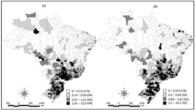 For 2005, the country presented 3740 innovation patents, while in 2015 this number rose to 5193, an increase of 38.85%. However, such growth does not occur homogeneously throughout the country. When considering regional levels, for example, a small number of microregions is responsible for most knowledge produced (patents) in the period. It is also evident the concentration of this innovative process, located mainly in the Center-South portion of the country, which was called by Gonçalves (2007) and Araújo and Garcia (2019), a North-South polarization regime. When comparing the initial period (a) versus the final (b), the production of patents per 100,000 inhabitants maintained the same spatial distribution and concentration. Therefore, the empirical evidences suggest the existence of an inertial process in the creation of patents, which indicates a potential path dependence for the production of knowledge in Brazil.