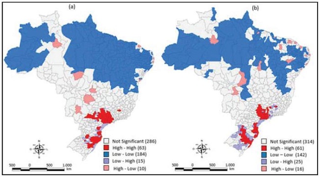However, in the second period (b), some microregions in the north and northwest were no longer significant, thus concentrating this cluster of high technological activity closer to microregions such as São Paulo and Campinas. According to Fernandes, Côrtes and Pinho (20004), the technology-based companies in São Paulo suffered from the country's economic crisis, which possibly impacted their innovative capabilities. Finally, this HH cluster is in line with the evidences found by Gonçalves (2007), Montenegro and Betarelli Júnior (2008), Montenegro, Gonçalves and Almeida (2011), Araújo and Garcia (2019) and Góis Sobrinho and Azzoni (2016).