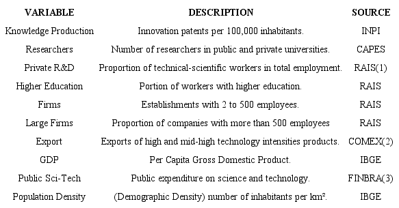 where represents the indicator of patents per 100,000 inhabitants for microregion in period , which represents the Knowledge Production in the EKPF; is the number of innovation patents; is the size of the population of the microregion in period . Therefore, microregions with lower population gain more weight in knowledge production, when compared directly with those that have large populations. This enables to measure more effectively the knowledge productivity of these regions. The explanatory variables, inputs in the EKPF, are described in Table 1.