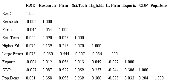 To capture the role of small (Firms) and large firms (Large Firms) in the knowledge production, we used the number of formal establishments with more than one employee per capita and the proportion of companies with more than 500 employees, respectively, from the RAIS (Relação Anual de Informações Sociais). The Firms variable seeks to capture the competitive structure of the local labor market since, according to Jacobs (1969) and Glaeser et al. (1992), a more competitive market produces greater incentive to innovation. On the other hand, the Large Firms variable tests if a regional structure with the presence of large companies could be more innovative, following Freitas, Gonçalves and Montenegro (2010). The GDP variable, representing the per capita Gross Domestic Product, seeks to control for the region’s economic scale, which may influence the innovation process directly and/or indirectly by impacting its direct determinants. Finally, we also check for possible correlations between the variables (Appendix A) in order to avoid multicollinearity problems. From them, we can notice no extremely high correlations that could compromise the model estimation.