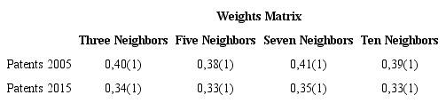 In addition, the spatial concentration in both periods is visible and to confirm we used the Exploratory Spatial Data Analysis (ESDA), which measures effects of spatial dependence and heterogeneity, association patterns (spatial clusters) and how the data are distributed. In particular, the Moran’s I statistics calculate the spatial autocorrelation of patentes across regions and its coefficients are in Table 2; whose values were positive and statistically significant independent of the weight matrix applied. Thus, microregions with a high number of patents per 100,000 inhabitants tended to be surrounded by microregions with also high values.