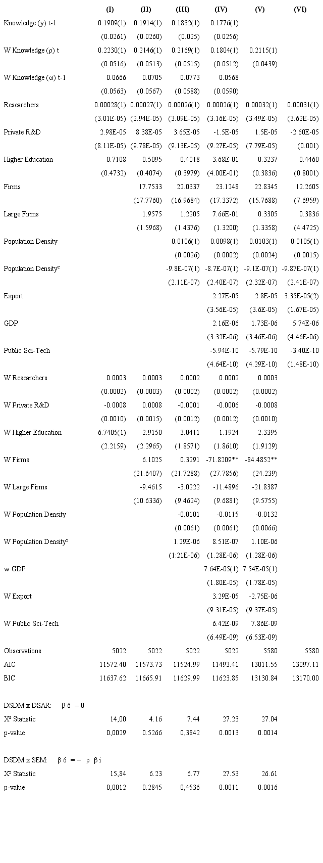 To define which spatial model that best represents and captures the dynamics of the knowledge production in Brazil, we compared the Dynamic Spatial Autoregressive Model (DSAR) and the Dynamic Spatial Durbin Model (DSDM). The comparison is performed by testing the hypothesis that the spatially lagged independent variables (WX) are jointly non-significant. The null hypotheses () was rejected by the 𝜒2 test, which presented a value of 27.23, significant at 1%, confirming that the Dynamic Spatial Durbin Model (DSDM) is the best model. To check the importance of the path dependence in knowledge production, capture by the temporal coefficient, we compared the results from the dynamic model with a static Spatial Durbin Model (SDM). By using a Likelihood-Ratio (LR) test, which resulted in a value of 50.86, significant at 1%, we confirmed the importance of path dependence to understand the knowledge production in Brazil. Finally, we test the Dynamic Spatial Durbin Model (DSDM) against the Spatial Error Model (SEM) to further support our empirical approach. In other words, if holds, then, the Spatial Error Model is the best model. The statistic presented a value of 27.53, significant at 1%, reinforcing the Dynamic Spatial Durbin Model (DSDM) as the best model to understand knowledge production in Brazil.