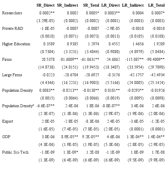 Therefore, considering the nature of this model, we cannot interpret the coefficients from Table 3 directly due to the presence of spatial spillovers and temporal persistence that causes indirect and long run effects, which are presented in Table 4. Among the results, we highlight the number of university researchers in the microregions, which obtained a positive and statistically significant direct and long run coefficients. This variable is part of the labor force, , employed in the search for new ideas, being intrinsically related to scientific and technological research, which, according to Nelson (1996), are important vectors of knowledge production and innovation.