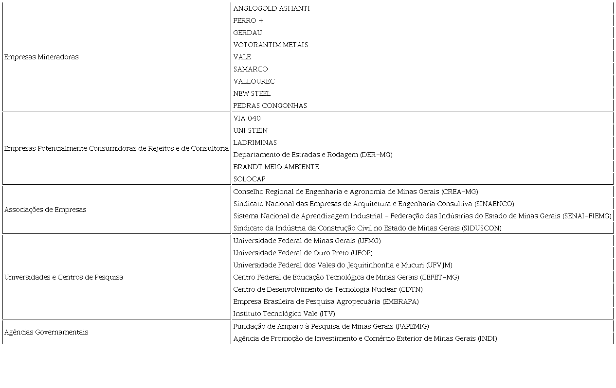 Destaca-se ainda que a Plataforma R3 Mineral foi constituída por 33 instituições, sendo 17 empresas mineradoras, 7 centros de pesquisa, 6 associações de empresas e 3 órgãos públicos, que decidiram espontaneamente participar desta rede, por adesão. Os atores integrantes são apresentados por meio do Quadro 1. Nele é possível perceber que a iniciativa chegou a reunir importantes elos da cadeia produtiva da mineração no estado, empresas de setores com o potencial para o consumo de produtos resultantes do reaproveitamento dos resíduos de minério e organizações do sistema de inovação. Nesse contexto, é destacável o potencial existente para a troca de informações e para o desenvolvimento de projetos conjuntos.