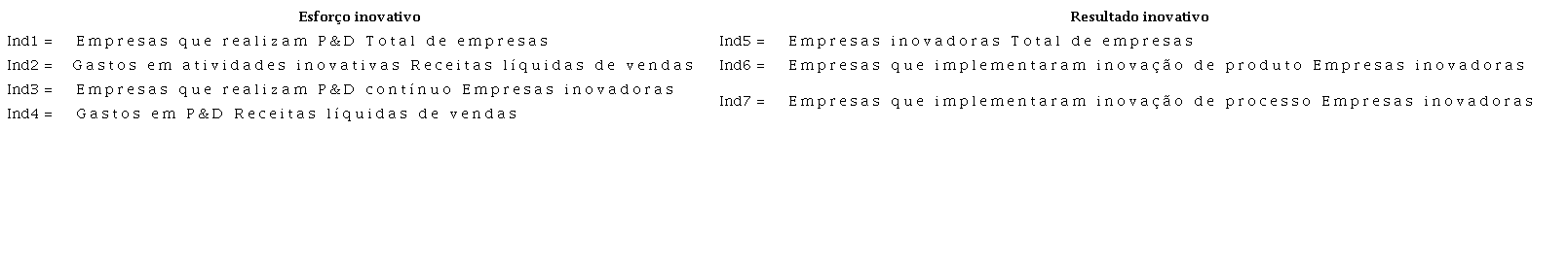 O esforço de construir indicadores para serem aplicados ao recorte de porte das empresas considera duas facetas do processo inovativo: esforço e resultado. O conjunto de indicadores para esforço inovativo são: i) participação de empresas que realizam P&D em relação ao total; ii) gastos em atividades inovativas em relação às receitas; iii) empresas que realizam P&D contínuo em relação às empresas inovadoras; e iv) gastos em P&D em relação às receitas. Por outro lado, os indicadores capazes de apresentar o dinamismo e/ou resultado inovativo são: i) empresas inovadoras em relação ao total de empresas; ii) empresas inovadoras de produto em relação às inovadoras; e iii) empresas inovadoras de processo em relação às inovadoras. Os indicadores são organizados e calculados pelo método da DE.