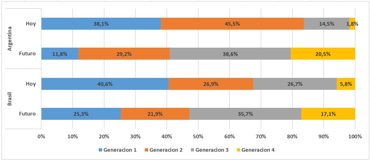 Las encuestas también permiten evaluar cómo las empresas de las muestras argentinas y brasileñas se preparan para la generación digital que proyectan a futuro. La asociación entre la generación digital esperada y el nivel de preparación indica si habrá condiciones para el avance planeado, así como el grado de coherencia entre la magnitud de la evolución esperada y el esfuerzo en curso para permitir esta evolución. La Figura 2 asocia las expectativas de las empresas de adopción de soluciones digitales en el futuro con las acciones en curso para lograrlo para las empresas de ambos países. En el caso de Brasil, en comparación con Argentina, existe una mayor correspondencia entre las expectativas de adopción futura y los esfuerzos realizados en esta dirección. También en este caso, se debe considerar que la mayor proporción de pequeñas empresas en la muestra argentina puede explicar, en parte, una menor capacidad para realizar esfuerzos más intensos en las distintas generaciones digitales.