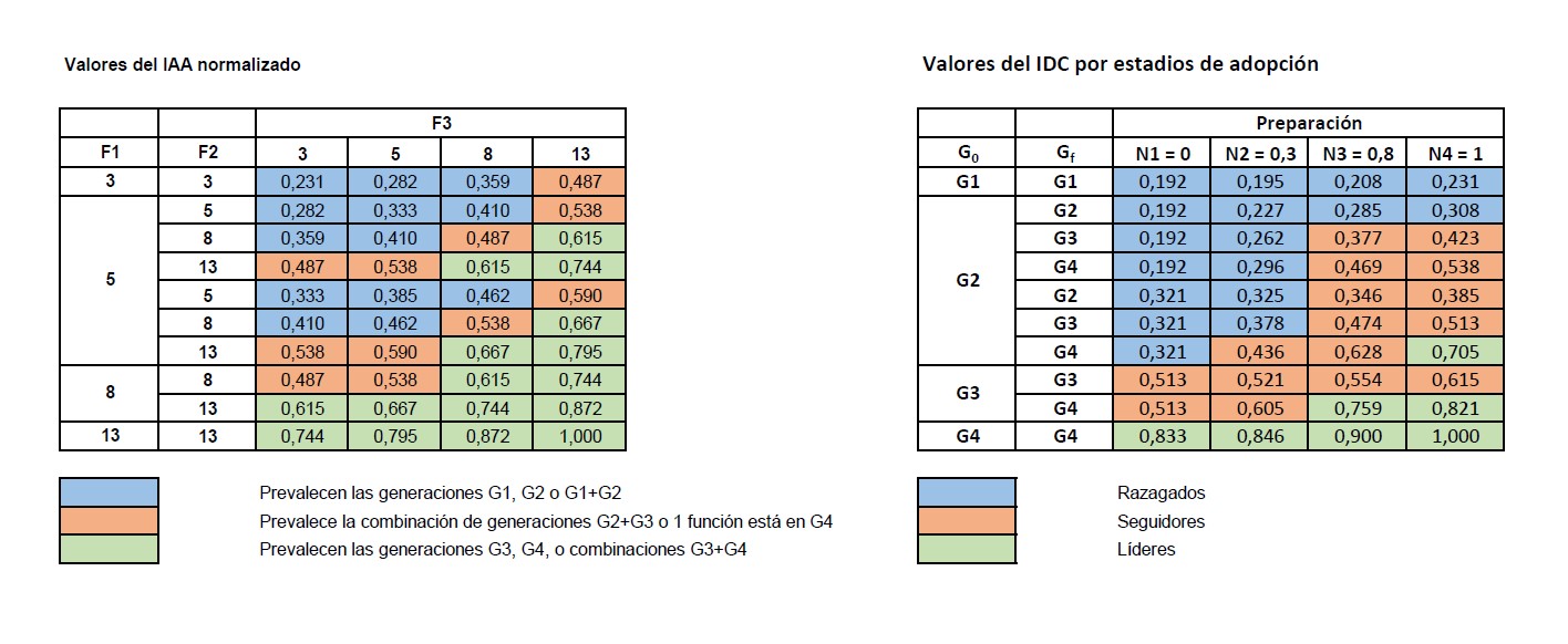 donde es la generación digital actualmente adoptada en cada una de las funciones empresariales; , la generación que se espera en el futuro;, el esfuerzo de preparación, que puede tomar 4 valores: "sin planes", nivel 1 = 0; “estudiando el tema para el futuro”, nivel 2 = 0,3; planeando digitalización para el futuro, nivel 3 = 0,8; “ejecutando planes para el futuro”, nivel 4 = 1; , el diferencial entre el valor esperado y el actual, tomando valores 0,6 para previsión de un salto de generación; 1,2 para dos saltos y 1,8 para tres saltos. Finalmente, es la tasa de descuento sobre el nivel de preparación. El IDC se calcula por función empresarial. La media de los IDC normalizados entre las tres funciones representa el IDC medio por empresa ¨() (Figura 3).