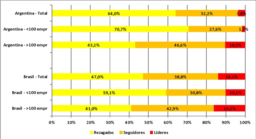 Los valores de la distribución del IDC medio normalizado fueron agrupados conforme a las tres categorías contempladas (líderes, seguidoras, rezagadas). Brasil presenta porcentuales mayores de empresas de la muestra en las categorías de líderes y seguidoras respecto a Argentina; mientras que Argentina presenta un porcentual mayor de empresas de la muestra entre los rezagados (Figura 4). Las empresas grandes se inclinan más a ser seguidoras en Argentina que en Brasil, aunque en Brasil, este tipo de empresas se inclina más a ser líderes. En ambos países, la mayor parte de las empresas se concentra en el grupo de rezagados y la menor en el grupo de líderes, siendo que las empresas grandes tienden a concentrarse más en el grupo de seguidoras que en el de rezagadas.