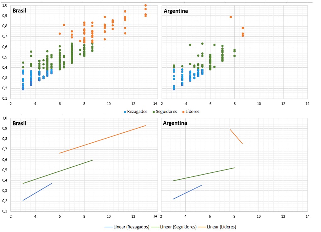 La relación entre el IDC normalizado y el IAA ofrece una visión dinámica de los estadios de digitalización (Figura 5). El grupo de empresas rezagadas sigue una distribución similar entre las empresas argentinas y brasileñas. En ambos países, el posicionamiento de salida es similar y, por lo tanto, las rectas de ajuste a las nubes de puntos son también similares. La recta de ajuste para Brasil tiene una inclinación levemente mayor que la de Argentina, lo que indicaría que las rezagadas brasileñas son más sensibles a la digitalización que las argentinas. Esta mayor sensibilidad podría asociarse a un escenario de inducción más fuerte en Brasil por parte de las líderes, algo que empujaría a las empresas atrasadas a tener una respuesta más rápida de adopción de soluciones digitales.