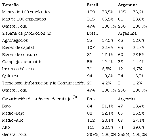 El emparejamiento entre empresas argentinas y brasileñas se realizó de acuerdo con la actividad principal. El panel final contiene 256 empresas argentinas de la encuesta de 2018 y 474 empresas brasileñas de la encuesta de 2020 (Cuadro 1). Como la encuesta argentina consideraba empresas con menos de 50 empleados y la brasileña no, las empresas fueron clasificadas entre mayores (grandes) y menores (pequeñas) de 100 empleados. Con esta distribución, el 66,5% de las empresas brasileñas son grandes, mientras que esta proporción representa menos del 23,8% entre las argentinas. La clasificación por sistema productivo siguió la propuesta previamente consolidada en la encuesta brasileña I-2027 (Cuadro 1). La distribución por sistema productivo tiene cierta equivalencia entre países con la excepción del sector de bienes de consumo, más presente en Argentina, y el sector químico, con una mayor participación en Brasil. Por otro lado, la capacitación de la fuerza de trabajo se midió como la proporción de trabajadores de alto nivel (grados en ingeniería, ciencia, tecnología y matemáticas) en relación con el número total de empleados a partir de dados da RAIS 2019. Como el perfil de capacitación puede variar según el sistema productivo, el cálculo del nivel de capacitación se realizó para cada sistema productivo en cuatro rangos (alto, medio-alto, medio-bajo y bajo) de acuerdo con la distribución del indicador por cuartiles.