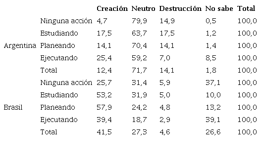 Argentina revela un patrón fuertemente concentrado en la percepción de neutralidad de impacto sobre el empleo para cualquiera que sea el nivel de preparación asociado (Cuadro 3). Las empresas argentinas de la muestra sin disposición para la digitalización, al contrario de las brasileñas, prevén un impacto mayor sobre la destrucción que sobre la creación, pero, sobre todo, consideran que las tecnologías digitales no tendrán efectos sobre el empleo y, como consecuencia sobre su crecimiento. En este sentido, la elección por la no disposición es coherente con la percepción de estas empresas sobre la importancia dada a las tecnologías como estrategia competitiva o de crecimiento. De forma similar, una mayor disposición en términos de estudio o elaboración de planes se corresponde con una expectativa positiva sobre la creación de empleo. Finalmente, 2 de cada 3 empresas que ejecutan proyectos reportan un impacto neutro sobre el empleo. En este caso, la neutralidad puede ser interpretada de dos formas. Por un lado, puede significar que la digitalización esté más asociada a una estrategia defensiva de manutención de su posición actual, más que a una estrategia ofensiva o de crecimiento. Por otro, la neutralidad puede significar un efecto neto previsto de creación-destrucción de empleo dentro de la firma.