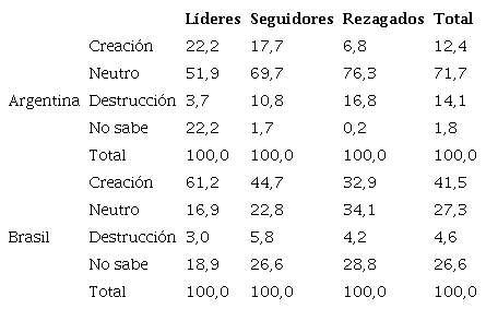El grupo de rezagados en las muestras se caracteriza por tener un escaso contacto con las tecnologías digitales y, por tanto, por una baja percepción de las oportunidades que ofrece y de las amenazas del letargo tecnológico. Un tercio de las empresas brasileñas rezagadas considera que la digitalización creará empleo y otro tercio considera que no habrá impacto. En Argentina, la neutralidad sobre el empleo adquiere, por si misma, un peso extraordinario (76,3%). En este caso, la neutralidad puede significar que las empresas no perciben la asociación entre digitalización y crecimiento o un desconocimiento sobre estas tecnologías y sobre el diagnostico de su impacto.