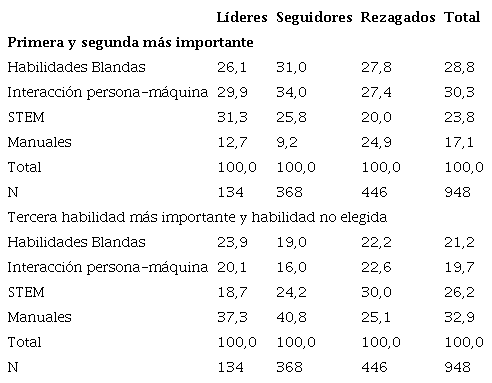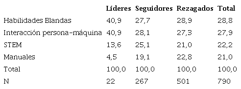 En Brasil, la disponibilidad de trabajadores con competencias STEM es la más relevante para las empresas líderes (la proporción es del 31,3%) (Cuadro 8). Las seguidoras otorgan una importancia similar a las habilidades blandas que a la interacción hombre-máquina. Entre las rezagadas no se identifica un patrón claro. Como en el caso argentino, las habilidades manuales son ignoradas principalmente por empresas líderes y seguidoras.