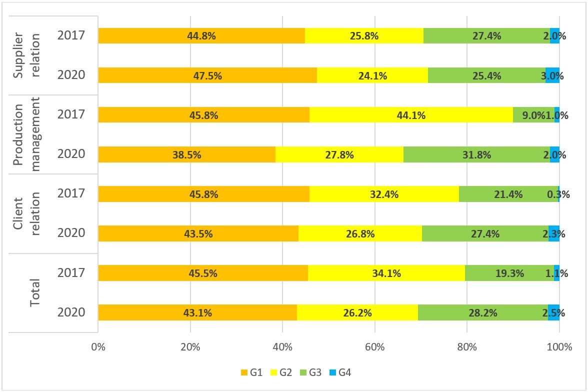 Observing changes by business functions, no significant changes occurred in the adoption of digital technologies to conduct supplier relations, despite a slight increase in the share of firms employing G4 solutions, from 2% to 3%. More noticeable changes appeared regarding client relations: the share of firms using G1 and G2 solutions fell almost 22%, and those employing G3 and G4 solutions increased eight percentage points. In production management, only 10% of firms employed G3 and/or G4 solutions in 2017, while three years later, the proportion became one in every three. Therefore, firms-oriented digitalization more to enhance production management and be closer to clients and less so in the relations with suppliers. Optimizing production leads to greater efficiency while being closer to clients ensures that firms adopting more advanced digital technologies keep or even expand market shares in a demand contracting environment.