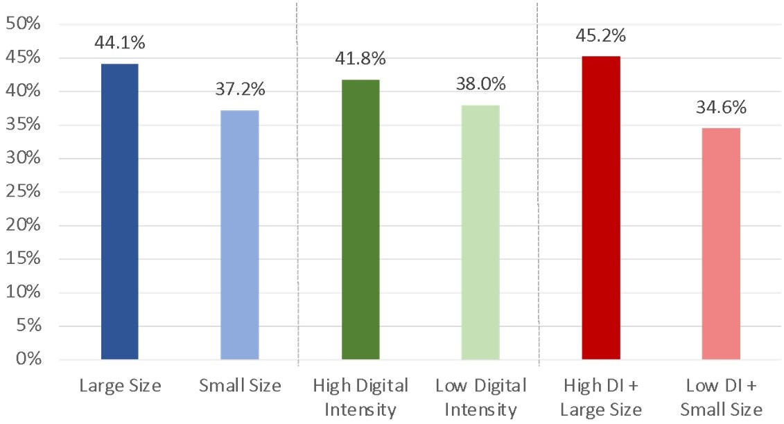 Figure 2 provides evidence confirming the likelihood of 2017 G1 or G2 users moving towards G3 and G4 in 2020. It also combines such evolution with size and sector of origin of firms. Larger firms have a 44.1% probability of performing business functions with digital G3 and G4 solutions by 2020, in contrast to a 37.2% probability for smaller-size firms. Sector-related differences are not as significant: a 41.8% probability for high digitally intensive activities compared to a 38% probability for low digitally intensive sectors. These determinants of digitalization become even more pronounced when firm size and sector of origin are jointly considered. Figure 3 shows that firms of larger size and belonging to high digitally intensive sectors are more likely to move from G1 and G2 in 2017 to G3 and G4 in 2019/2020 than their smaller size, low-digitally-intensive-sector peers (45.2% versus 34.6%).
