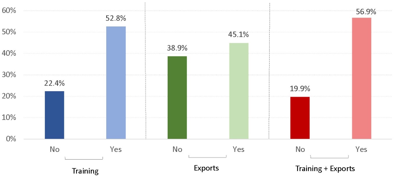 Additional exercises were carried out to examine more thoroughly whether combining the two most outstanding variables (engagement in exports and training) positively affect firms’ digitalization drive. Figure 3 shows that being an exporter and providing training increases firms’ probability of moving forward from G1 or G2 to G3 or G4 by just about 57%.