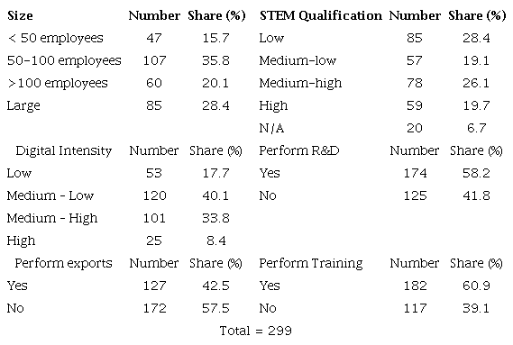 The panel comprises 299 firms and four variables from the surveys: the sectoral digital intensiveness (CALVINO et al., 2018), the engagement in R&D, labor training and sales to foreign markets. Two additional variables were included from the Annual Social Information Database (RAIS): number of employees, used as a proxy of firm size, and, as a proxy of capabilities, the ratio of employees’ formal education in STEM (Science Technology, Engineering, and Mathematics) related disciplines to total employees of a firm, weighted by each sector of origin of firms.