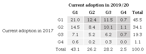 About 80% of all possible movements, either progress, standstill, or regression, are concentrated in G1 and G2. In 2017, 21.1% of total cases were adopting G1 solutions and remained there in 2019/20; 12.4% moved forward to G2; and 11.5% advanced to G3. However, 14.5% of cases using G2 solutions in 2017 returned to G1 later; 8.4% remained at G2; and 10.1% advanced to G3. Movements backwards prevail in firms adopting G3 and G4 in at least one business function. In 2017, 19.3% and 1.1% of all observations used G3 and G4 solutions, respectively; around 12,3% of the business function positioned in G3 in 2012 returned to G1 and G2, 6.2 stand in G3 and only 0,7% advanced to G4. In 2019/20, 0.3% of the observed business functions at G4 moved backward and none remained.