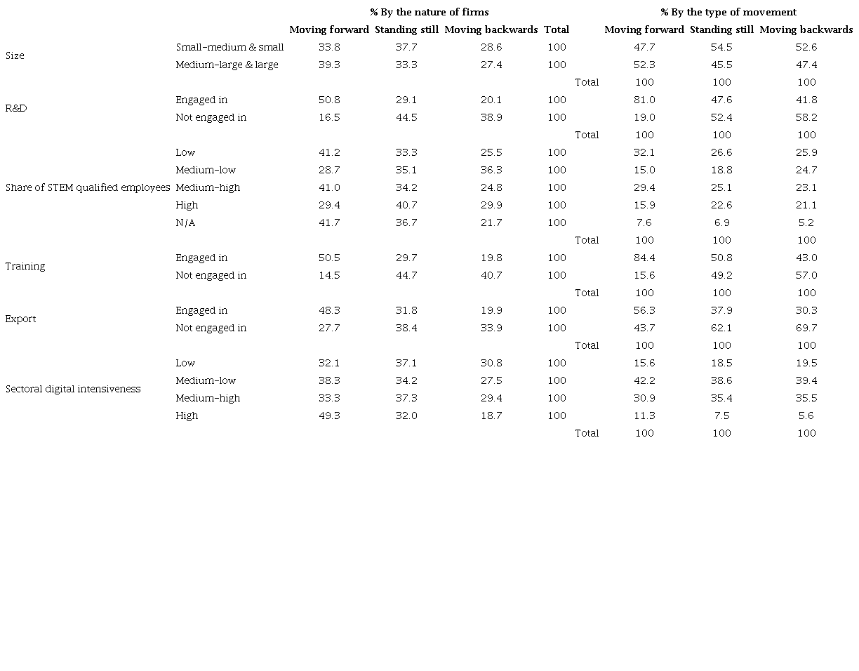 Firms engaging in R&D and training tend to progress more (81% and 84.4%, respectively), whereas firms not undertaking these activities tend to recede in digital adoption (58.2% and 57%, respectively). Advancing in digital adoption is also a feature of export-oriented firms (56.3%), while inertia and receding are widely a feature of non-exporters (62.1% and 69.7%, respectively). Qualification in STEM competences does not offer a clear pattern. Advances are noted in firms with relative low qualification (32.1%), but also among firms with medium-high qualification.