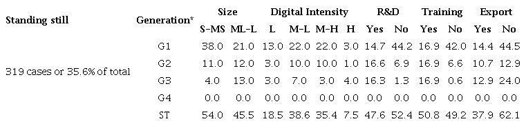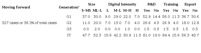 Tables 4A, 4B, and 4C provide detailed results considering the different digital generations and firm profiles according to the adoption pattern observed in all business functions: moving forward, standing still, or moving backwards, respectively. The forward-movement of firms (Table 4A) is observed mostly in business functions of small and medium-sized companies departing from G1 in 2017 and medium large and large companies starting at G2. Sector-wise, firms operating in medium-low and medium-high digital intensity industries showed propensity to move away from G1. More than half of the observed cases of firms advancing from G1 and almost a quarter of those moving forward from G2 carried out R&D and training activities. The propensity to move forward from any initial generation adopted in 2017 is always higher among export-oriented firms.
