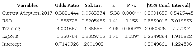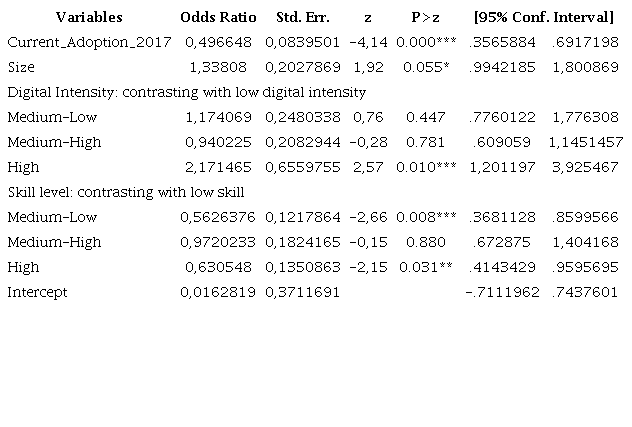 The results concerning the odds ratio (significant at 1% level) indicate that, for firms that already employed solutions of more advanced digital generations to perform any of the business functions, the odds of advancing to a higher digital generation decrease almost 50% from 2017 to 2019-20, everything else held constant (Table 5). Such a result confirms proposition 1: firms that adopt more advanced digital generations in 2017 are less likely to move forward, because they are already closer to the digital technological frontier. Results for firm size and sector of origin were also significant: being a large firm increases in 33.8% the odds of moving forward in digital adoption from one period to the other, all else constant. Operating in a digital-intensive sector increases by 117.1% the likelihood of adopting more advanced digital technologies to perform any business functions. These results confirm propositions 2 (size matters) and 4 (sector of origin and engagement in exports matter).