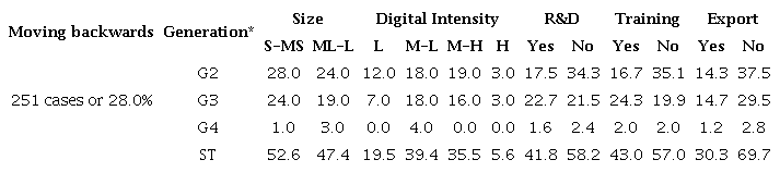 Finally, Table 400C brings information about firms’ digital backward movement. Setbacks are concentrated in the G2 and G3 generations with a relatively even distribution in the business functions of firms of all sizes, although more prominently the medium-low ones (52.3%). The backward movement also cuts across sectors, regardless of their digital intensity, with a relatively higher weight for medium-low digital intensity. About one third of the firms that move backward are not engaged in R&D and training activities. Regarding performance, about 70% of receding companies are not exporters and most of them regraded from G2.