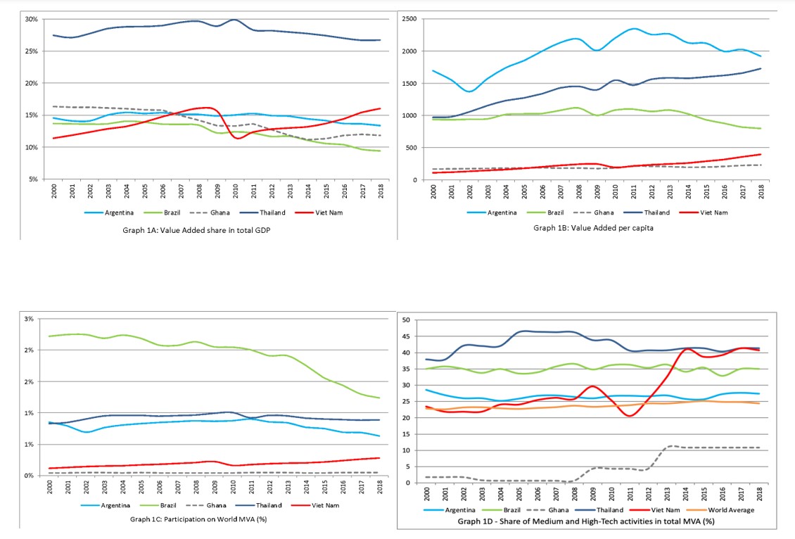 In terms of their productive structure, it is important to reveal the evolution of the manufacturing industry as it is associated in some sense with the capacity to create and absorb new technologies. On average, the share of the manufacturing sector in relation to GDP for the period 2000-2018 was higher in Thailand (around 28%) in comparison to the rest of the countries, whose shares are around 13%-14% (Graph 1A). Except for Vietnam, such indicator evolves negatively in all countries, with a more pronounced fall in Brazil. The level of Manufacturing Value Added per capita was higher for Argentina, followed by Thailand and Brazil (Graph 1B). About the impact of a country on world manufacturing value added (Graph 1C), Brazil stands out for the largest share (1.94%), despite an annual average drop of 3.1% over the period. Thailand observes an average share of 0.93% followed by Argentina (0.8%), Vietnam (0.19%) and Ghana (0.05%)