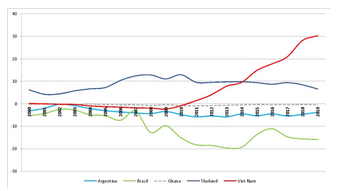 Concerning the participation of medium and high technology sectors in the total value added of manufacturing, Thailand shows the highest share on an average between 2000-2018 (42.2%), followed by Brazil (35.1%) and Argentina (26.6%) (Graph 1D). Vietnam had an average of 28.9% during the period considered, but since 2011, due to their engagement in regional value chains, the country significantly improved its trade share of these goods. Except for Ghana, all countries have a higher proportion than the world average (around 23%), however well below the average observed by the five4 main countries in the world that was around 65%. The evolution of this indicator shows some stability in Argentina and Brazil, a small growth in the case of Thailand and a more expressive growth in the case of Vietnam. Such performance has a reflection in foreign trade, especially in terms of goods linked to the Information and Communication Technologies (ICT). These goods are traditionally connected with a robust digital infrastructure. In this regard, Vietnam was the only country with a growing surplus over 2000 to 2019 (Graph 2).