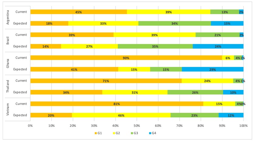 Significant progress is expected in the future, especially by high and medium-high-technology firms: only a small proportion (between 11.4% and 25.3%) of firms from Argentina, Brazil, Thailand and Vietnam expect to remain at G1 and between 11.8% and 28% expect to adopt G4 digital technologies, with the highest expectation for Brazil. Country-based differences among low- and medium-low-technology intensity is higher. In Brazil, 18.3% expect to remain at G1 in five to ten years ahead; in Argentina this amount is 21.4%, for Vietnam 25.7%, Ghana 41.2% and for Thailand is 44.9%. So, the variation between them is not negligible.