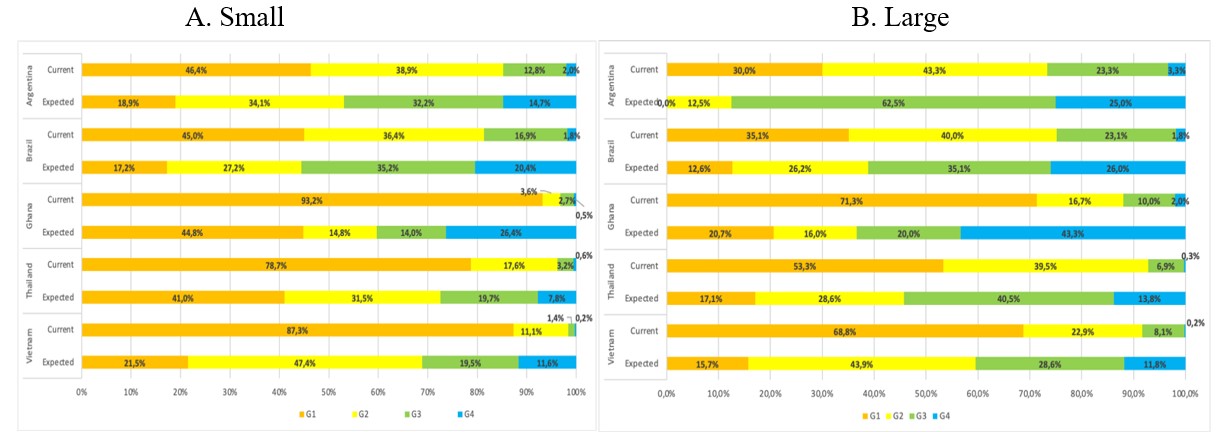 In terms of expectations of adoption in relation to current adoption, the differences among countries are also more pronounced by firm size. In Argentina, large firms intend to evolve from G2 and G3 currently (43.3% and 23.3%, respectively) to G3 and G4 in the future (62.5% and 25.0%). Regarding small firms, 85.2% currently adopt either G1 or G2 and, in the future, intend to move towards G2 and G3 generations (66.4% of firms), with only 14.7% adopting G4 technologies. Such stepwise Argentine pattern is also to be found in Thailand and Vietnam even if with less pronounced expectations for the future. Currently, in Thailand and Vietnam above 90% of firms adopt either G1 or G2, regardless the size. In the future, the majority of large Thai firms (69.1%) expect to adopt either G2 or G3 and almost 13.8% of firms hope to reach the most advanced digital generations. In contrast, 72.5% of small firms will remain at either G1 or G2. In Vietnam the pattern is similar, with large firms located at G2 or G3 and small firms at G1 or G2, in the future. What calls the attention of the Vietnam case is the fact that it is the only country where the expectations of small firms towards more advanced digital technologies is quite the same in comparison with the expectations of large firms.