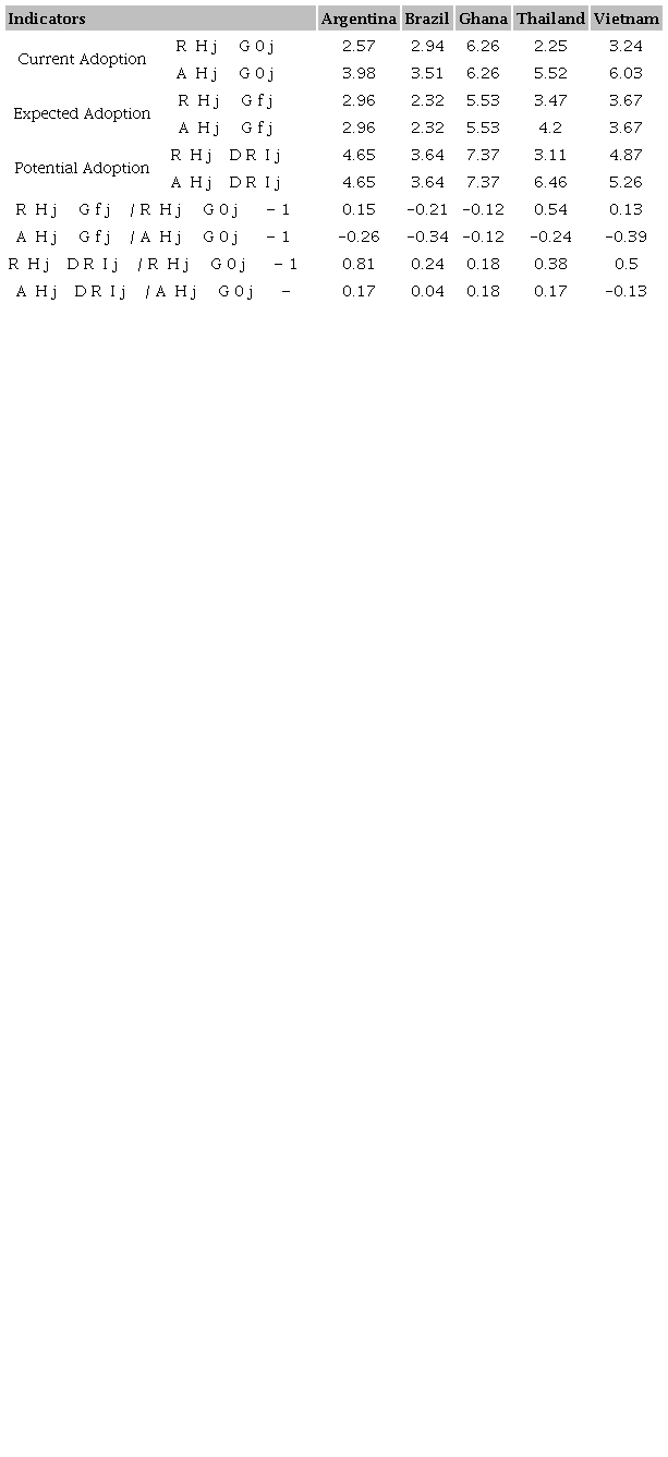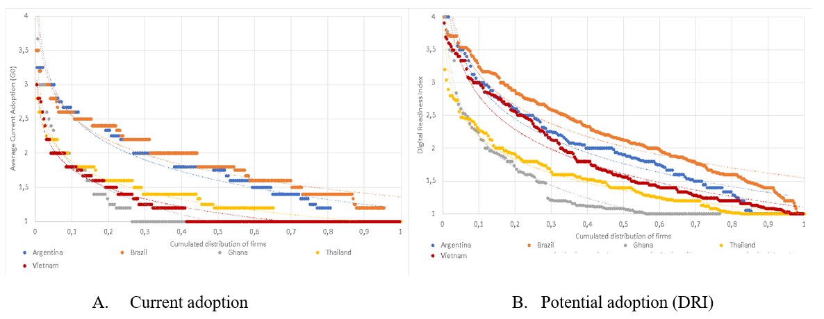 As observed, current adoption in Vietnam and Ghana follow a Polarized Heterogeneity distribution, in which only less than 10% of the distribution reaches the maximum values around G3 and a large share of firms (between 60% and 70%) are still at G1. In contrast, Argentina and Brazil follows a Distributed Heterogeneity of the current adoption values among firms with maximum values at around 3,5. Thailand presents an intermediate situation. The maximum value of current adoption is around 3, but the values are distributed by groups. That is, a large group of firms report the same level of current adoption. This large groups stands in values between 1 and 1,6.