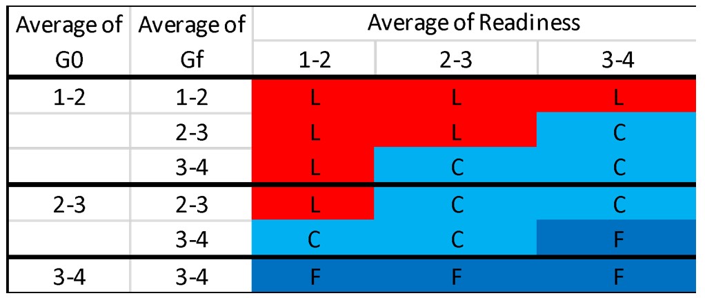 3. Average Readiness Level: , where means the readiness level for the business function i. As the current and expected digital adoption, the readiness level also has four categories of action: (1) no action, (2) studying, (3) have a plan and (4) have a plan under execution. In the same way, will also vary from 1 to 4 as an average.