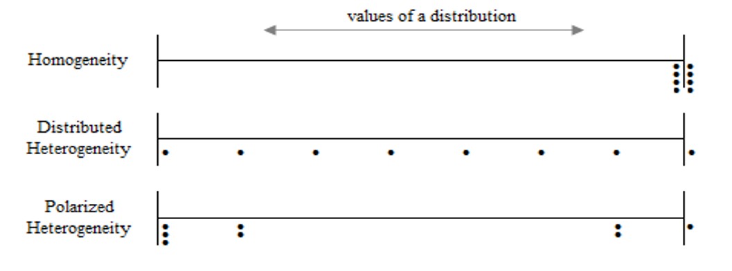Heterogeneity can be defined as the antithesis of homogeneity. Homogeneity is the representation of a perfect equality among parts. In a distribution, homogeneity is the situation in which all values are equal, independently if these values are very high or very low (Figure 2). Any situation out of homogeneity defines different types of heterogeneity. Heterogeneity can be presented in at least two cases. The first one is where the values of the distribution are all different and are, on some degree, symmetrically distant. This is the distributed heterogeneity situation. The second one is where some values of the distribution can be equal in specific groups, but they are expressively distant, ones from the others. This is the polarized heterogeneity situation.