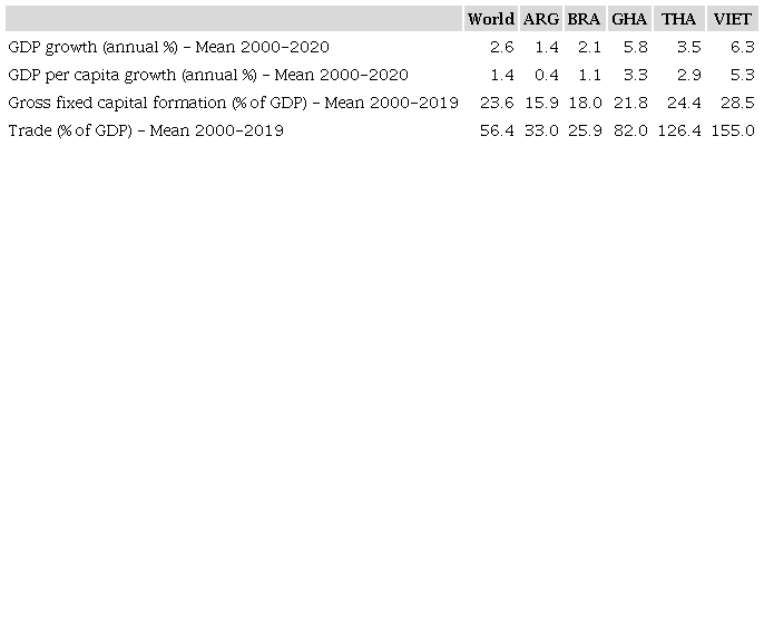 On the same line, investments, as measured by the average annual rate of Gross Fixed Capital Formation in relation to GDP between 2000-2019, present higher values than the world average only for Vietnam and Thailand. This is an important measure as it signals the construction of conditions that allows for catching up and the creation of productive capacity. Concerning the degree of trade openness, measured by the participation of foreign trade in relation to GDP, Table 1 shows a relatively greater trade opening in Vietnam and Thailand compared to Brazil and Argentina, while Ghana is placed in an intermediate position.