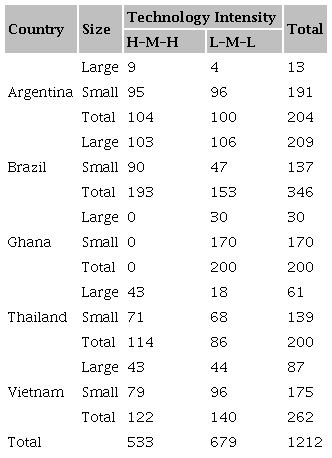 For the empirical evaluation of the process of adoption of DBT, reliable databases and indicators at the firm level, especially in developing countries, are scarce and confined to a few technologies and sectors (CIRERA et al., 2021). This article explores a unique database of the current and projected adoption of different generations of digital solutions in five business functions – relations with suppliers, production management, product development, relations with clients and business management – covering 5 countries, Argentina, Brazil, Ghana, Thailand and Vietnam1, through direct surveys undertaken between 2017 and 2019 focusing on manufacturing firms. From these surveys a comparable panel of 1,212 firms was organized and appropriate indicators were developed to allow the enquiring of the following questions2: (i) How advanced is the process of digital adoption in these countries? (ii) Does size and sector of origin explain differences in the observable patterns of digital adoption? (iii) At the level of countries, how is the distribution of the distance between more and less advanced technology adopters? Is the adoption pattern similar?