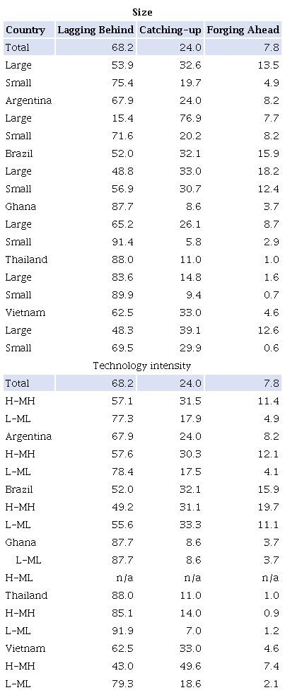 In terms of countries specificities, Argentina and Vietnam present a similar result: a large base where lagging behind firms is located at an intermediate and smaller group of catching up firms, and an upper group for the elite of forging ahead firms with between 4.6% to 8.2% of the total of these two countries. Ghana and Thailand are also similar but, in their case, there are a larger number of firms in lagging behind condition (more than 85% for both), with a small group from each country considered as moving forward. The Brazilian pattern is different in comparison to the others since it has the highest proportion of firms catching-up and forging ahead: 32.1% and 15.9%, respectively.