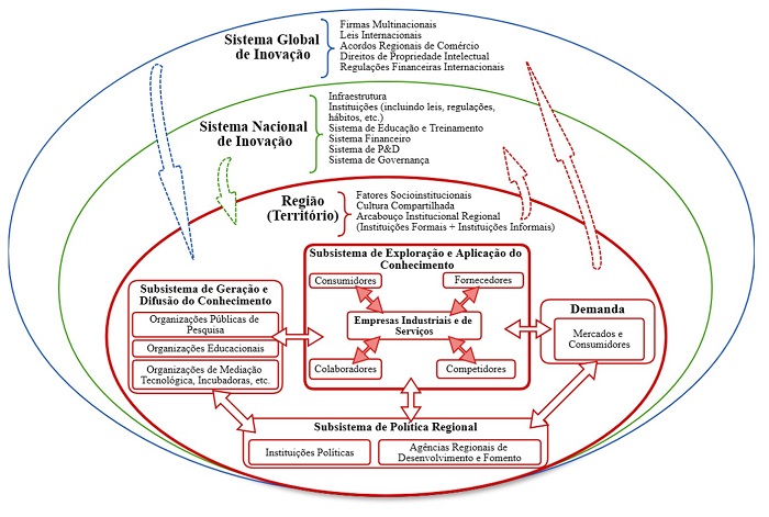 Complementarmente, um SRI deve ser entendido como um sistema aberto ao passo que a inserção da região no contexto nacional e internacional são importantes. O SRI se relaciona com dois contextos mais amplos: o do Sistema Nacional de Inovação (SNI), que inclui infraestrutura, arcabouço institucional (legal e regulatório), sistema financeiro e sistema de educação; e do Sistema Global de Inovação, que engloba empresas transnacionais, leis internacionais, acordos comerciais, regulamentações financeiras e direitos de propriedade intelectual.