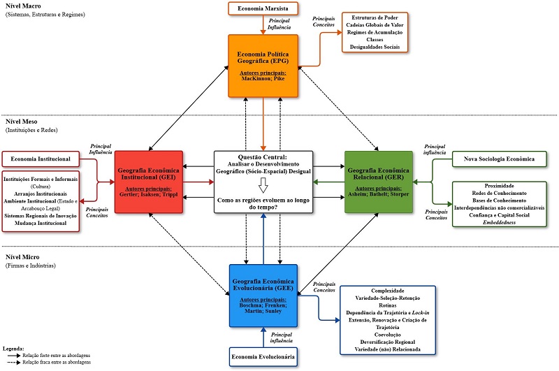Nesse contexto, emerge como campo teórico e metodológico a Geografia Econômica Evolucionária, que busca justamente romper com a lógica de equilíbrio e explicar de forma dinâmica o processo da evolução das regiões ao longo do tempo. A robustez conceitual fez com que essa abordagem se tornasse dominante nos anos posteriores ao seu lançamento. O sucesso, no entanto, expôs suas lacunas e fragilidades, mas, ao mesmo tempo, mostrou sua flexibilidade em se adaptar e incorporar insights, contribuições e conceitos de outras abordagens da Geografia Econômica, tais como a Institucionalista, Relacional e a Economia Política Geográfica, agregando outros níveis de análise (meso e macro) e permitindo a expansão do framework analítico e do instrumental conceitual e metodológico.