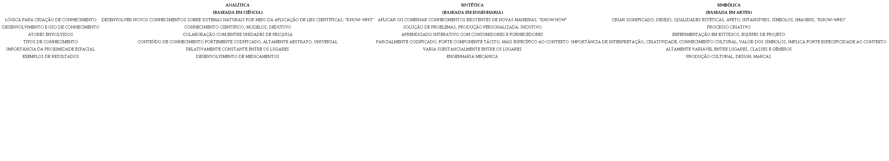 Como sugerido por Asheim e Gertler (2005), a distinção entre diferentes tipos de Base de Conhecimento – Analítica (científica), Sintética (técnica) e Simbólica (baseada em cultura) – leva em consideração que as inovações se baseiam não somente em tipos de conhecimento diferentes, mas também em distintos modos de aprendizado, critérios para validação do conhecimento e desafios à inovação específicos, bem como diferentes tipos de interação entre atores nos processos de criação, transmissão e absorção do conhecimento. Esta classificação é entendida como uma lista de tipos ideais. Na prática, a maioria das atividades compreende mais de uma base de conhecimento, e o grau em que prevalece certa base de conhecimento varia entre indústrias, firmas e diferentes tipos de atividades e ocupações dentro das mesmas. O Quadro 1 resume as principais características das Bases de Conhecimento citadas anteriormente.