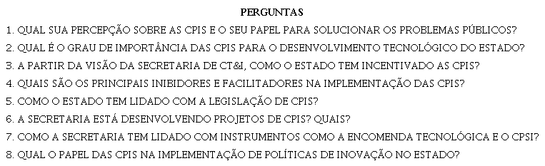 Por fim, entrevistas semiestruturadas foram realizadas com os secretários estaduais de CT&I. O processo de coleta de dados envolveu contatos com gabinetes e setores de imprensa, com ligações telefônicas e e-mails enviados. Essas secretarias foram escolhidas por sua participação direta na formulação de políticas de tecnologia, pesquisa, empreendedorismo e competitividade, e por seu conhecimento sobre os facilitadores e inibidores das CPIs em nível estadual. O roteiro de entrevista foi baseado em categorias analíticas (Quadro 2) e o procedimento aprovado pelo Comitê de Ética em Pesquisa (CAAE n° 67762023.3.0000.5188).