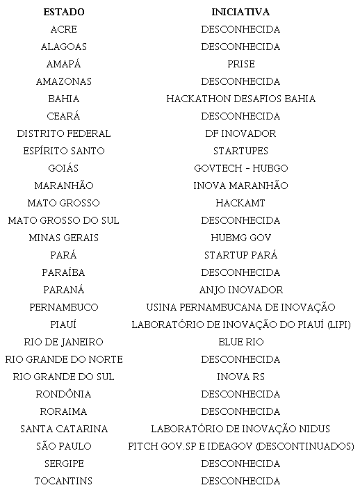 Inicialmente, uma busca no Google com o descritor “programa de inovação aberta + governo de [estado]”, foi realizada, seguida por consultas nos sites das secretarias de CT&I para identificar iniciativas públicas de aquisição de soluções inovadoras. Embora o termo “inovação aberta” abranja diversas iniciativas, como educação tecnológica e aceleração de startups, apenas aquelas que mencionam explicitamente a aquisição de soluções inovadoras foram consideradas.