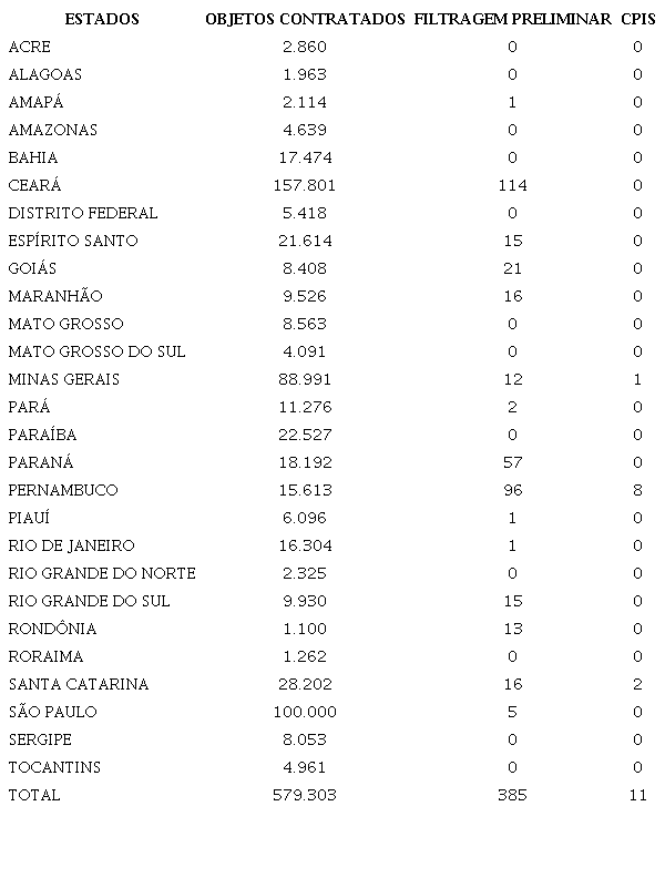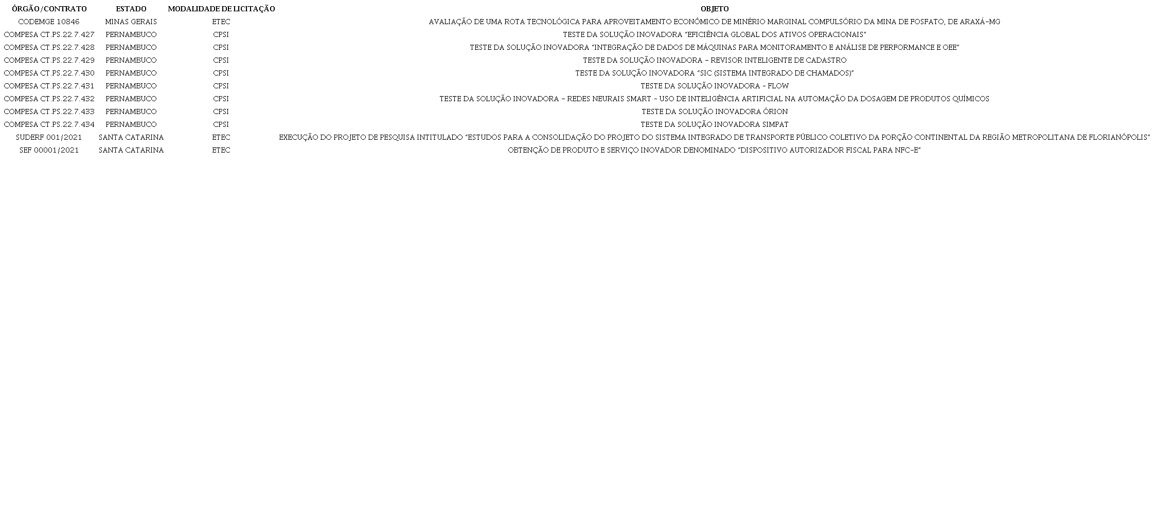 Para analisar essas iniciativas da Administração Pública estadual, foram mapeadas as contratações públicas de inovação nos Portais de Transparência e Dados. O foco desse levantamento foram as aquisições de solução inovadora (stricto sensu), excluindo compras pré-comerciais, conforme a categorização de Edquist e Zabala-Iturriagagoitia (2012). De acordo com a Tabela 3, esse processo identificou 579.303 (quinhentos e setenta e nove mil e trezentos e três) objetos de contratação pública. Conforme descrito na metodologia, após a filtragem automatizada no Microsoft Excel®, que descartou bens e serviços comuns, restaram 385 objetos de contratação de interesse. Esses objetos foram analisados manualmente, restando 11 contratações de soluções inovadora (stricto sensu), realizadas por meio de CPSI ou ETEC.