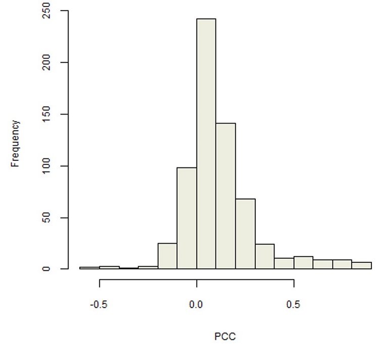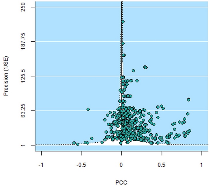 Heterogeneity of effect sizes is measured by a Q test, which is essentially a chi-squared test with the null H0: PCC1=…=PCCn (VIECHTBAUER, 2007). The rejection of the null hypothesis provides evidence of heterogeneity (that goes beyond sampling error). Homogeneous effect sizes rarely apply in social sciences, because effect sizes can usually differ from a single average result. In this case, the unobservable ui is added to the model (HIGGINS; THOMPSON; SPIEGELHALTER, 2009; RHODES, 2012) to take that effect into account. Consequently, we get PCCi∼0(β0; τ2+vi) with τ2 representing the variance between papers or its heterogeneity level. This leads to the heterogeneous effects model3: